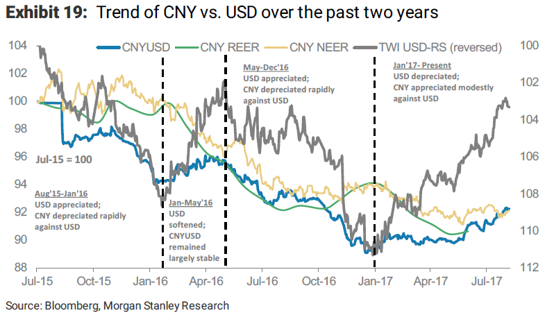 大摩首席中国经济学家邢自强邢自强认为,人民币汇率2017年末预期上调至6.60(vs. 彭博问卷市场共识的6.85)、2018年末上调至6.80(vs. 彭博问卷市场共识的6.90),符合今年美元兑一篮子货币汇率走弱的背景。