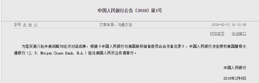 为落实第八轮中美战略与经济对话成果,根据《中国人民银行与美国联邦储备委员会合作备忘录》,中国人民银行决定授权美国摩根大通银行(J. P. Morgan Chase Bank, N.A.)担任美国人民币业务清算行。