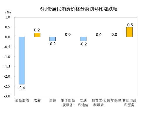 5月份,食品烟酒类价格环比下降2.4%,影响CPI下降约0.77个百分点。食品中,鲜菜价格下降12.5%,影响CPI下降约0.33个百分点;畜肉类价格下降5.7%,影响CPI下降约0.41个百分点,其中猪肉价格下降8.1%,影响CPI下降约0.37个百分点;蛋类价格下降4.1%,影响CPI下降约0.02个百分点;鲜果价格下降0.8%,影响CPI下降约0.01个百分点;水产品价格上涨1.3%,影响CPI上涨约0.02个百分点;粮食价格上涨0.3%,影响CPI上涨约0.01个百分点。