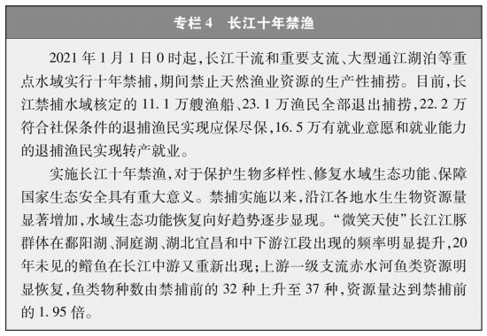 以共抓大保护、不搞大开发为导向推动长江经济带建设。长江是中华民族的母亲河,也是中华民族发展的重要支撑。中国坚持把修复长江生态环境摆在压倒性位置,协调推动经济发展和生态环境保护,努力建设人与自然和谐共生的绿色发展示范带,使长江经济带成为生态优先、绿色发展的主战场。发挥产业协同联动整体优势,构建绿色产业体系,加快区域经济绿色转型步伐。大力推进长江保护修复攻坚战,深入实施城镇污水垃圾处理、化工污染治理、农业面源污染治理、船舶污染治理和尾矿库污染治理“4+1”工程,全面实施长江十年禁渔,开展长江岸线利用项目及非法矮围清理整治。2018年以来,累计腾退长江岸线162公里,滩岸复绿1213万平方米,恢复水域面积6.8万亩,长江干流国控断面水质连续两年全线达到Ⅱ类。