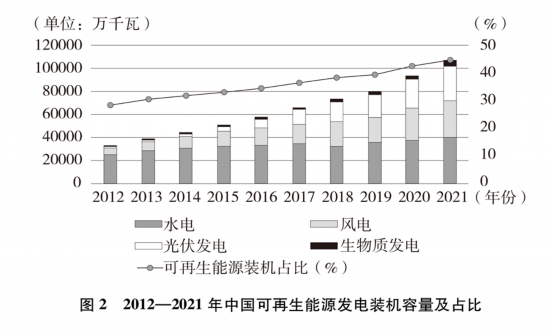 大力发展非化石能源。加快推进以沙漠、戈壁、荒漠地区为重点的大型风电光伏基地建设,积极稳妥发展海上风电,积极推广城镇、农村屋顶光伏,鼓励发展乡村分散式风电。以西南地区主要河流为重点,有序推进流域大型水电基地建设。因地制宜发展太阳能热利用、生物质能、地热能和海洋能,积极安全有序发展核电,大力发展城镇生活垃圾焚烧发电。坚持创新引领,积极发展氢能源。加快构建适应新能源占比逐渐提高的新型电力系统,开展可再生能源电力消纳责任权重考核,推动可再生能源高效消纳。截至2021年底,清洁能源消费比重由2012年的14.5%升至25.5%,煤炭消费比重由2012年的68.5%降至56.0%;可再生能源发电装机突破10亿千瓦,占总发电装机容量的44.8%,其中水电、风电、光伏发电装机均超3亿千瓦,均居世界第一。