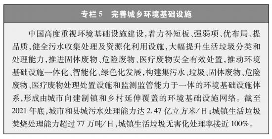持续打好污染防治攻坚战。环境就是民生,青山就是美丽,蓝天也是幸福。中国坚持精准治污、科学治污、依法治污,以解决人民群众反映强烈的大气、水、土壤污染等突出问题为重点,持续打好蓝天、碧水、净土保卫战。区域联防联控和重污染天气应对成效显著,全国地级及以上城市细颗粒物(PM2.5)年均浓度由2015年的46微克/立方米降至2021年的30微克/立方米,空气质量优良天数比例达到87.5%,成为全球大气质量改善速度最快的国家。工业、农业、生活污染源和水生态系统整治加快推进,饮用水安全得到有效保障,污染严重水体和不达标水体显著减少,2021年全国地表水水质优良断面比例达到84.9%。全面禁止洋垃圾入境,实现固体废物“零进口”目标,土壤环境风险得到基本管控。蓝天白云、繁星闪烁,清水绿岸、鱼翔浅底,人们呼吸的空气更清新、喝的水更干净、吃的食物更放心、生活的环境更优美,切实感受到生态环境变化带来的幸福和美好。