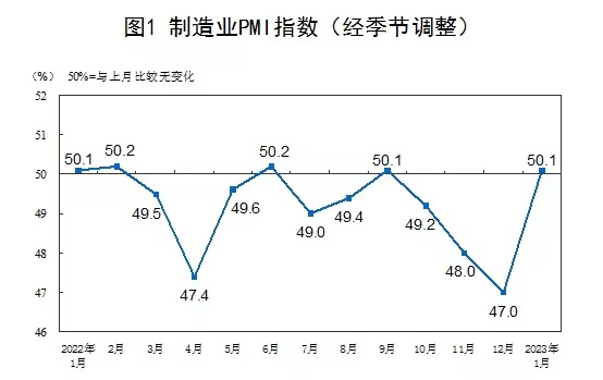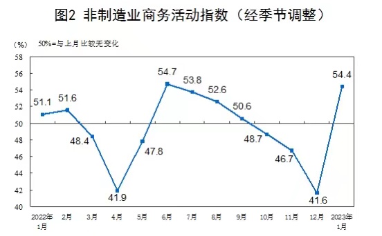 国家统计局31日公布数据显示,2023年1月份,制造业采购经理指数、非制造业商务活动指数和综合PMI产出指数分别为50.1%、54.4%和52.9%。